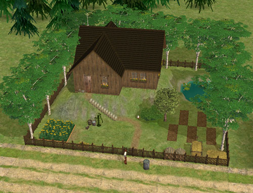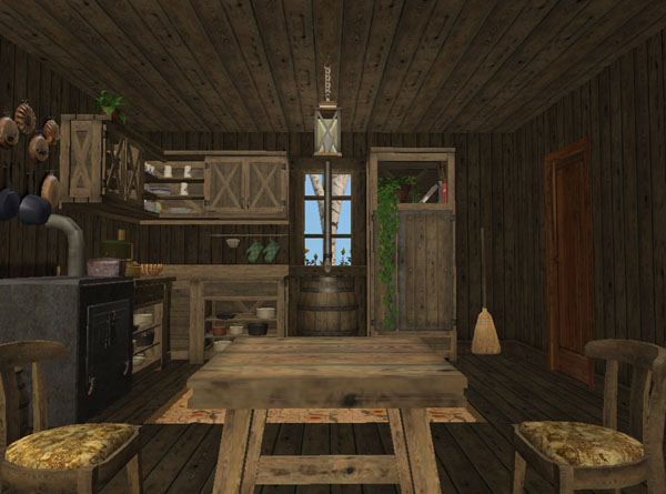 一方かな子さんの住居はこんな感じに。ちょっと小高い場所にある小屋って感じです。こっちは1LDKな間取り。樹が沢山あると落雷が怖いので、屋根に避雷針を実装済みですが、これって一応効果あるん?