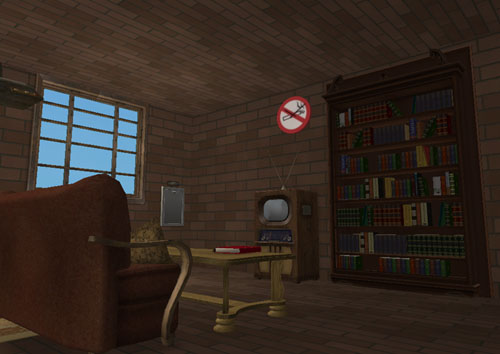 今回から導入されてる新オブも早速入れてみました。奥に見える銀色のはダストシューター、いわゆるゴミ箱です。右にあるでかい本棚は、実は寝室への入り口になってます、ええ。隠し扉は男のロマン。